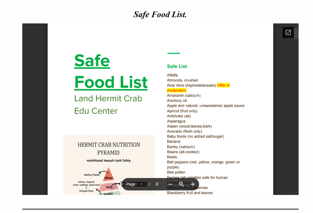 The Safe List, downloaded from the Crabby Hermit Facebook Group Files and the “Printable Guides” of the landhermitcrabeducenter.com and land-hermit-crab-edu-center.com sites, as well as viewable in the past from within the blog post is compared to the file as currently available, accessible, and free for personal use from The Crab Street Journal, “What’s for dinner? A hermit crab food guide!” article at https://crabstreetjournal.org/blog/2016/04/22/hermit-crab-food-guide/ * and https://docs.google.com/document/d/113toruv4u7NJxPYdM8-xVXZ7W4duiC54EvKqrh33-pY/edit?usp=sharing